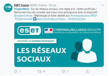 L’entreprise a diffusé une fiche pratique de 10 points pour se protéger sur les réseaux sociaux. https://cdn1.esetstatic.com/ESET/FR/Docs/cybermalveillance/FP_ReseauSociaux.pdf